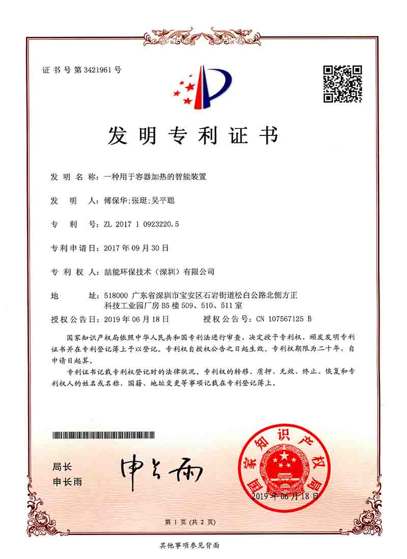 專利證書:一種用于容器加熱的智能裝置?